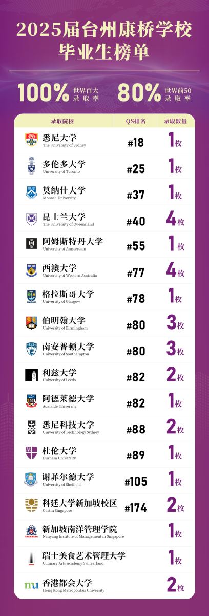 近日,各海外院校陆续发出offer,截止目前,我校首届G12的同学们已成功斩获了多份来自QS世界大学排名TOP100院校的录取通知书,80%的学生获得QS世界排名前40的录取。