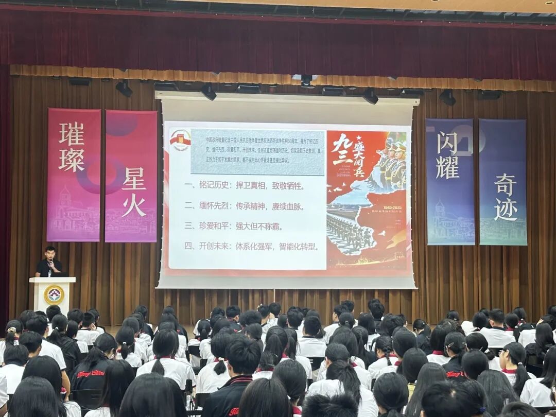 阅兵仪式结束后,历史老师宋汉文为中学部同学进行现场解读,串联历史脉络,帮助大家更好地理解此次阅兵的意义,理解和平的来之不易。
