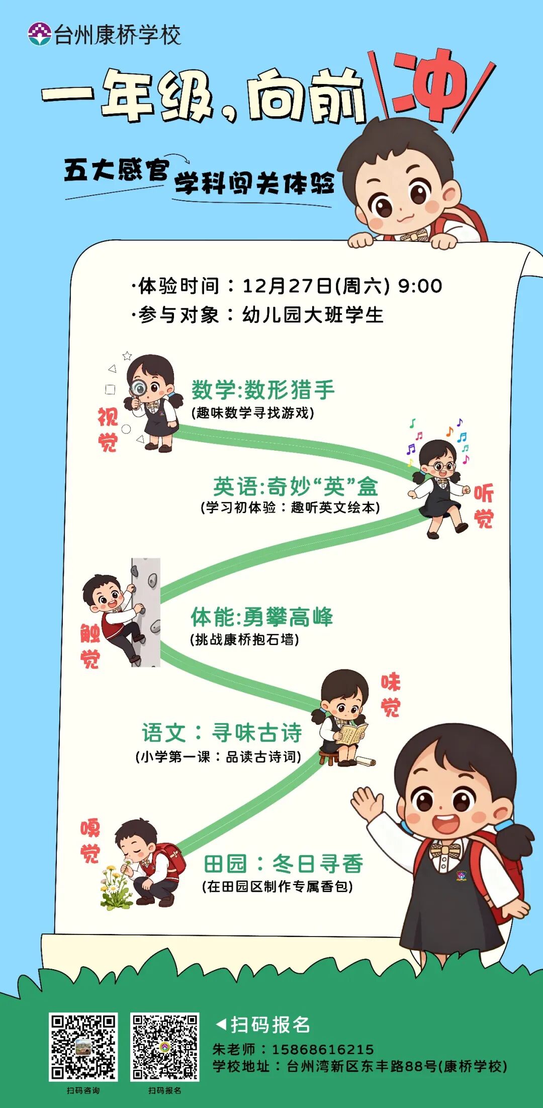 12月27日(上午)我们将以五大感官为纽带,精心设计串联数学、英语、语文、体能与田园课程,打造沉浸式闯关旅程。孩子们将走进真实的小学场景中,通过触摸、观察、聆听、奔跑与协作,在玩耍中建构对知识的初印象,在探索中内化小学生的行为自信。